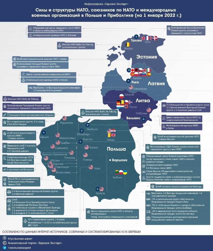 Рис. 1. Силы и структуры НАТО, союзников по НАТО и международных военных организаций в Польше и Прибалтике (по состоянию на 1 января 2022 г.)