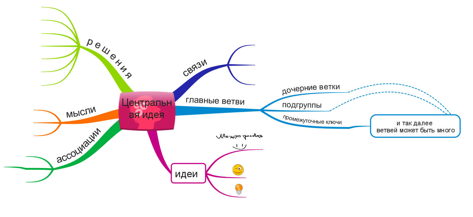 Интеллект-карта имеет древообразную структуру и предусматривает поэтапное развитие иерархии важности информации. Чтобы более глубоко понять, как применять ментальные карты, можно ознакомиться со статьей «Как можно использовать ментальные карты» и прочитать книгу «Карты памяти» самого Тони Бьюзена, создателя этих карт