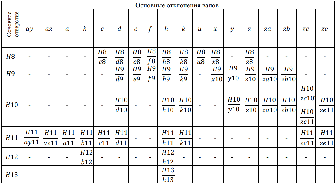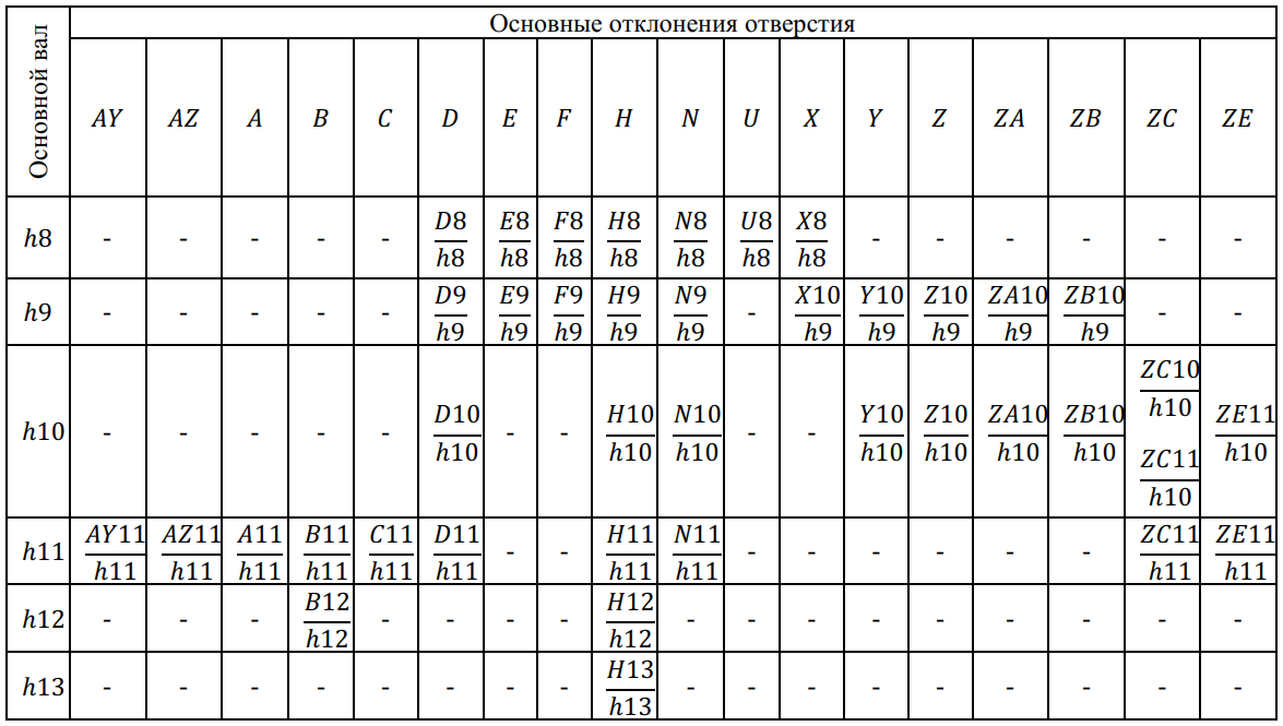 Буквенные обозначения основных отклонений приняты в алфавитном порядке, начиная от отклонений, обеспечивающих самые большие зазоры в соединении. Сочетанием различных отклонений вала и отверстия можно получить посадки разного характера (зазор, натяг или переходная).