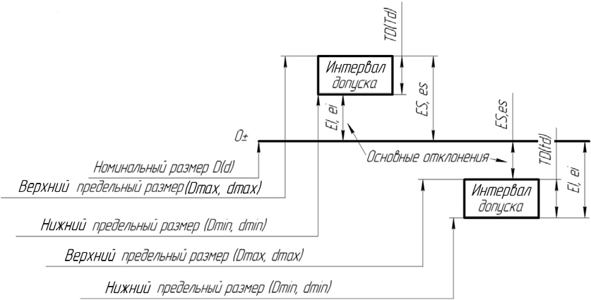 TD(d) = D(d)max – D(d)min = ES(es) + EI(ei), при этом следует учитывать знаки предельных отклонений, поскольку допуск на размер детали всегда положителен (не может быть меньше нуля).