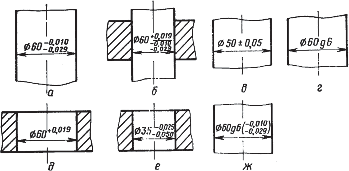 - числовыми величинами (рис. 4, а), причем отклонение, равное нулю, опускается (рис. 4, д), а одинаковые по абсолютной величине, но противоположные по знаку отклонения указывают один раз со знаками ± (рис. 4, e);