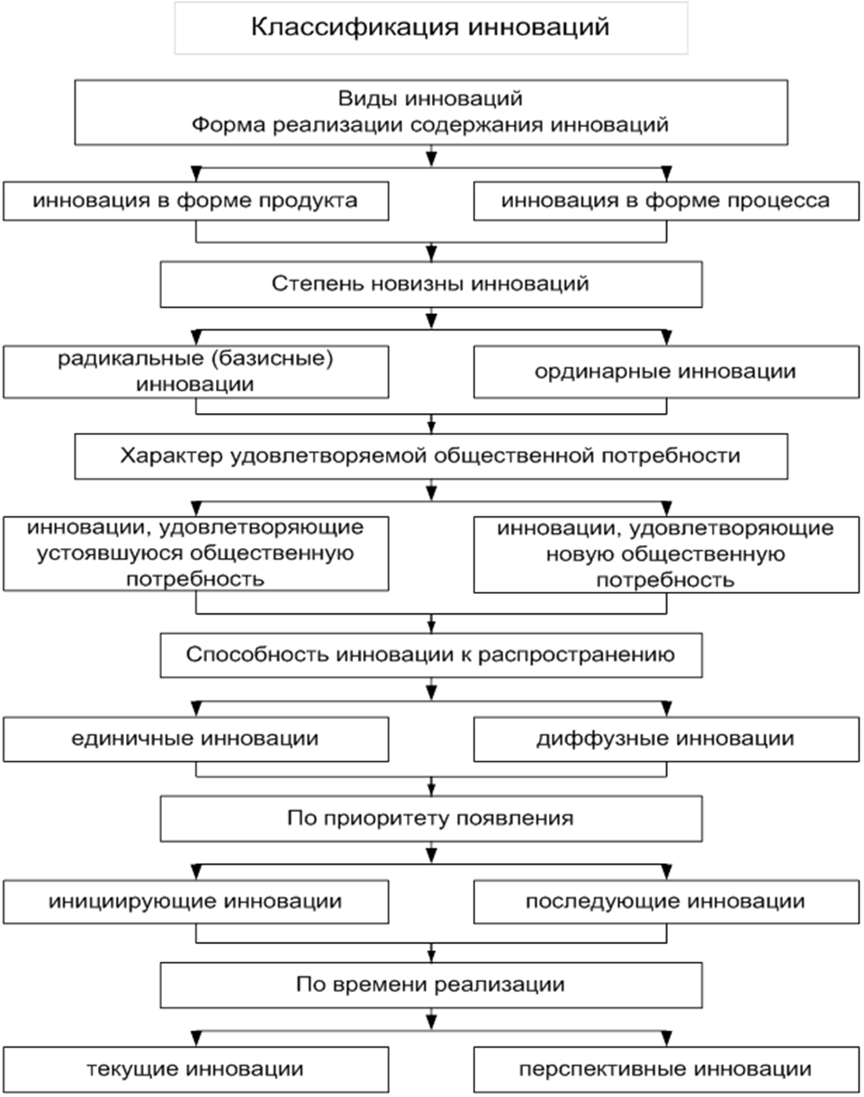 В зависимости от содержания и формы реализации инновации могут быть представлены в виде продукта или процесса. В первом случае речь идет о получении новых продуктов или услуг, нацеленных на удовлетворение определённых рыночных потребностей, а во втором – о новых элементах, вводимых и организационные, управленческие, производственные, маркетинговые и иные процессы.