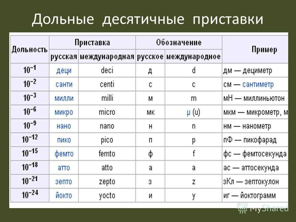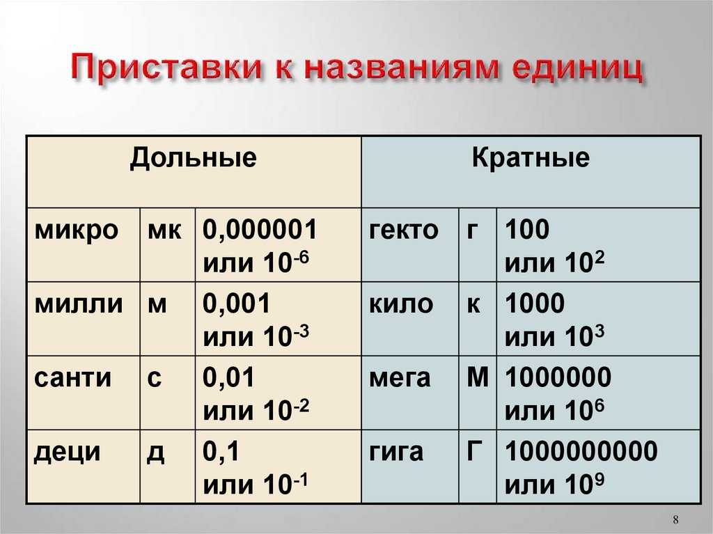| 10 +6 | мега | М | м | микро | 10 -6 | |