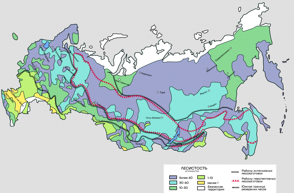 - основные лесные массивы произрастают в Сибири, на Дальнем Востоке и на территории европейского Севера;
