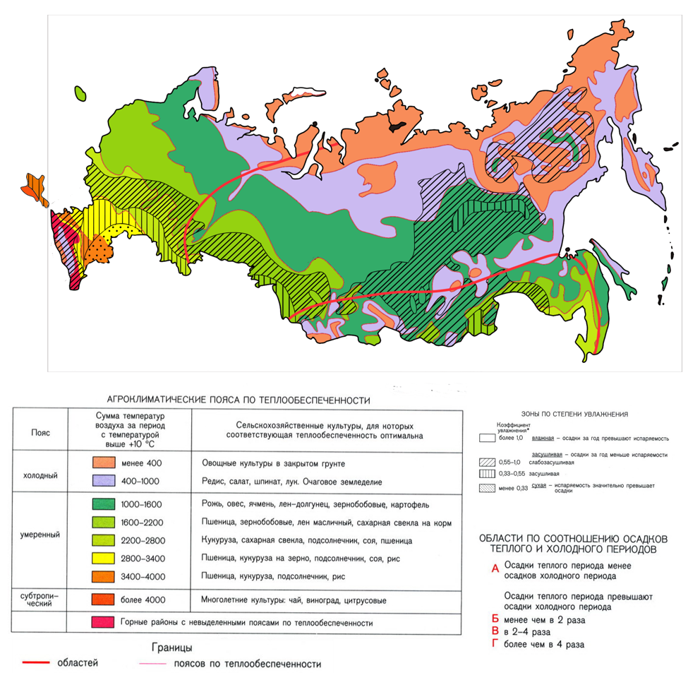 | Суммы температур говорят нам о том, какие с/х культуры тут можно выращивать. Поэтому определять регионы по выращиванию пшеницы и т.п. лучше всего по карте агроклиматических ресурсов. |