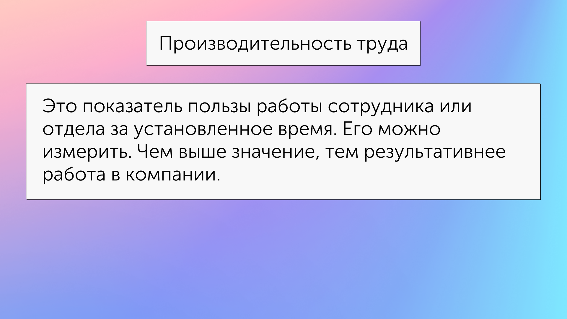 Производительность труда (ПТ) показывает, какую пользу приносит работа сотрудника или целого отдела за установленное время. Например, помогает посчитать, сколько деталей за час вытачивает на станке токарь, или какое количество товаров за месяц продают менеджеры завода. Это позволяет создавать нормативы и планировать развитие организации.
