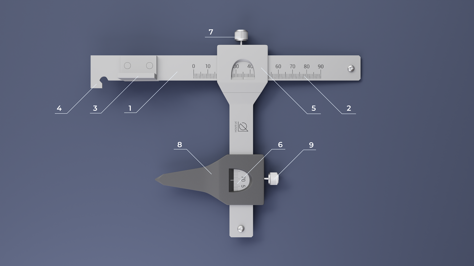 | 1 – линейка 2 – шкала линейки 3 – упор 4 – лапка 5 – движок 6 – шкала движка 7 – винт крепления движка 8 – ножка движка 9 – винт крепления ножки движка |