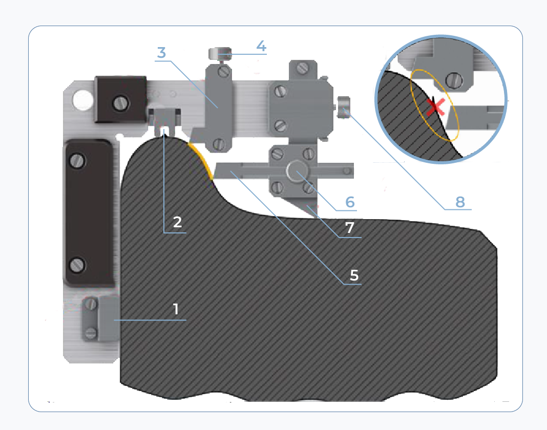 | 1 — опора 2 — паз для определения наплыва 3 — движок с верхним упором 4 — стопорный винт движка 5 — нижний упор 6 — стопорный винт нижнего упора 7 — планка 8 — стопорный винт планки |