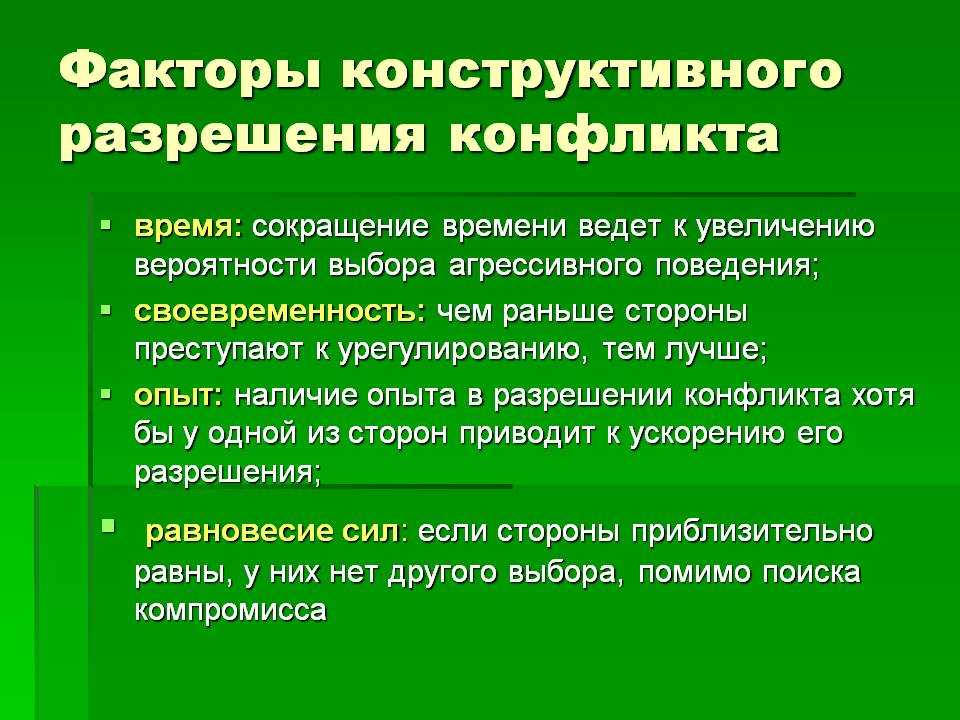 Успешность разрешения конфликта зависит от того, учитывают или не учитывают его стороны те факторы, которые оказывают влияние на конкретный конфликт.