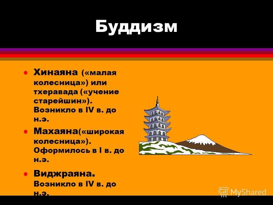 Буддизм l Хинаяна («малая колесница») или тхеравада («учение старейшин»). Возникло в lV в. до н.э. l Махаяна («широкая колесница»). Оформилось в l в. до н.э. l Виджраяна. Возникло в lV в. до н.э.