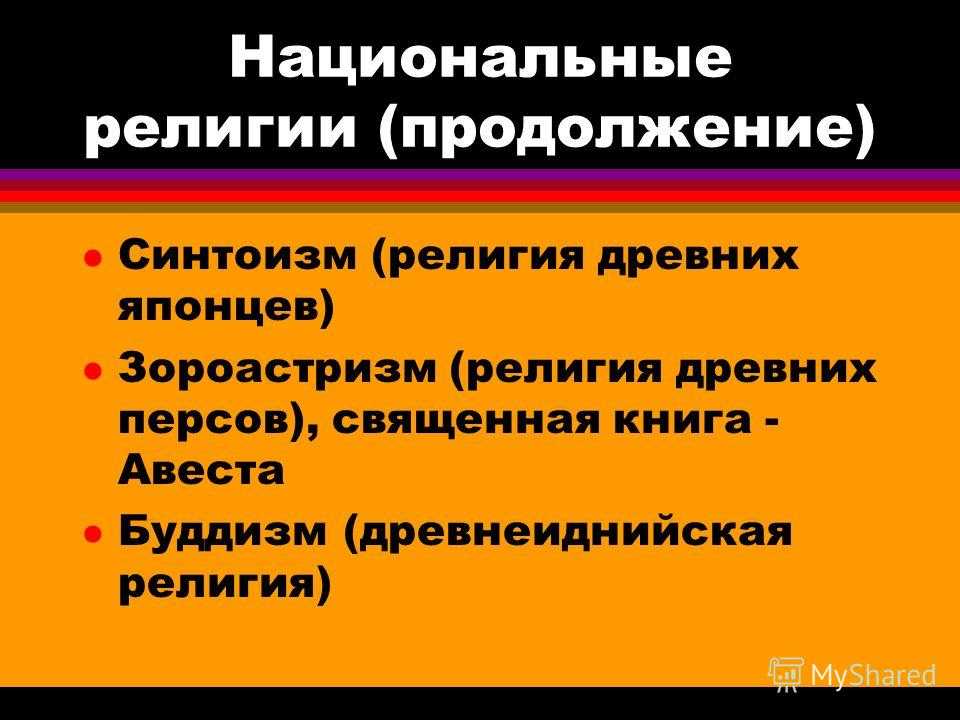 Национальные религии (продолжение) l Синтоизм (религия древних японцев) l Зороастризм (религия древних персов), священная книга — Авеста l Буддизм (древнеиднийская религия)