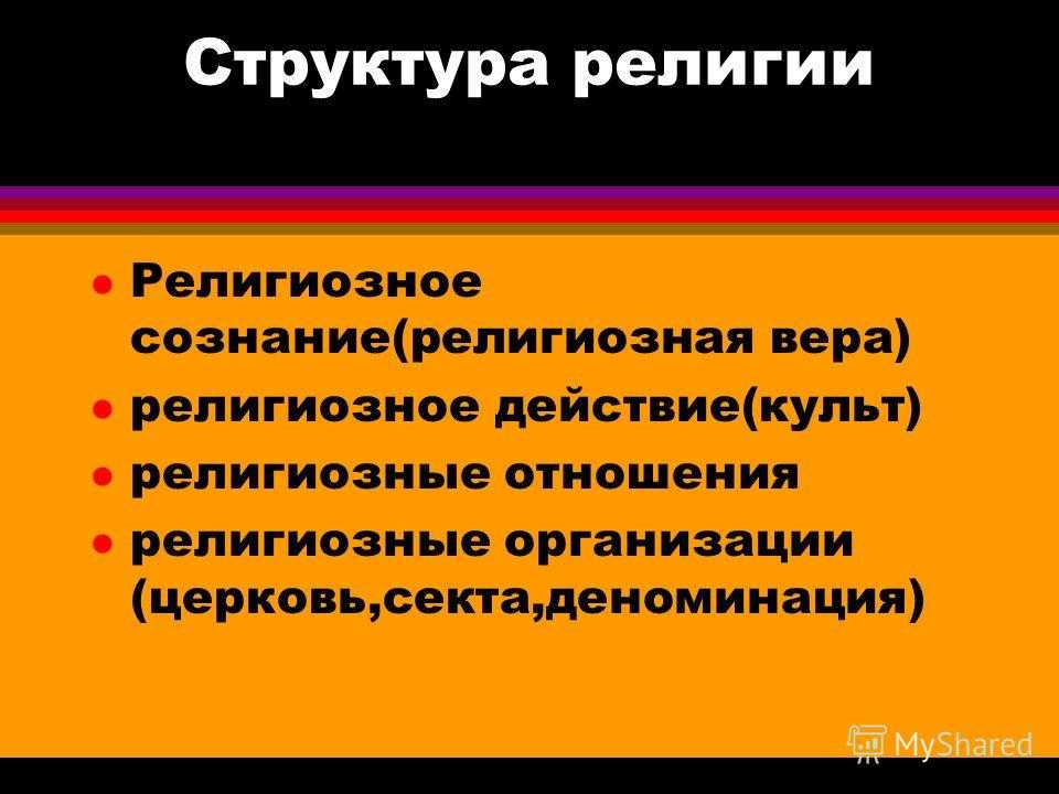Структура религии l Религиозное сознание(религиозная вера) l религиозное действие(культ) l религиозные отношения l религиозные организации (церковь,секта,деноминация)