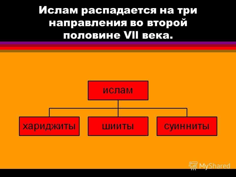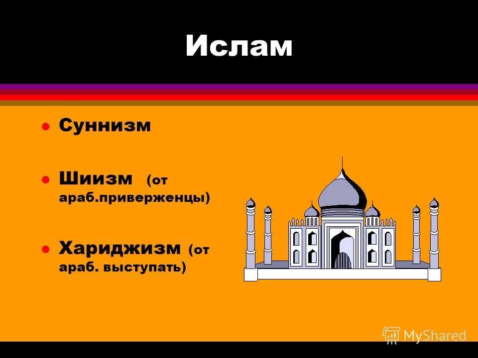 Ислам l Суннизм l Шиизм (от араб.приверженцы) l Хариджизм (от араб. выступать)