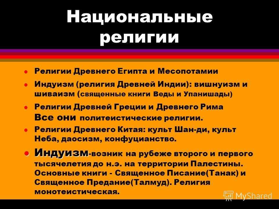 Национальные религии l Религии Древнего Египта и Месопотамии l Индуизм (религия Древней Индии): вишнуизм и шиваизм ( священные книги Веды и Упанишады) l Религии Древней Греции и Древнего Рима Все они политеистические религии. l Религии Древнего Китая: культ Шан-ди, культ Неба, даосизм, конфуцианство. l Индуизм l Индуизм -возник на рубеже второго и первого тысячелетия до н.э. на территории Палестины. Основные книги — Священное Писание(Танак) и Священное Предание(Талмуд). Религия монотеистическая.