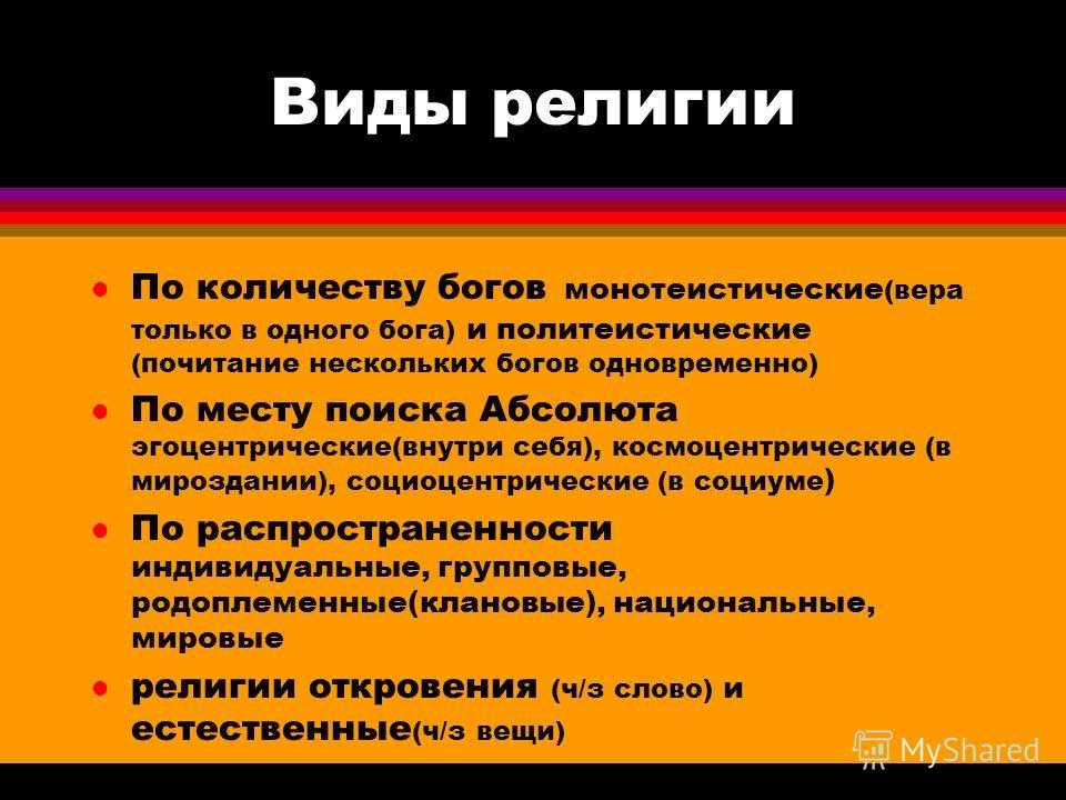 Виды религии l По количеству богов монотеистические (вера только в одного бога) и политеистические (почитание нескольких богов одновременно) l По месту поиска Абсолюта эгоцентрические(внутри себя), космоцентрические (в мироздании), социоцентрические (в социуме ) l По распространенности индивидуальные, групповые, родоплеменные(клановые), национальные, мировые l религии откровения (ч/з слово) и естественные (ч/з вещи)