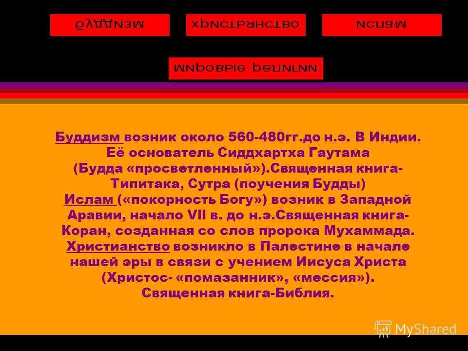 Буддизм возник около гг.до н.э. В Индии. Её основатель Сиддхартха Гаутама (Будда «просветленный»).Священная книга- Типитака, Сутра (поучения Будды) Ислам («покорность Богу») возник в Западной Аравии, начало Vll в. до н.э.Священная книга- Коран, созданная со слов пророка Мухаммада. Христианство возникло в Палестине в начале нашей эры в связи с учением Иисуса Христа (Христос- «помазанник», «мессия»). Священная книга-Библия.