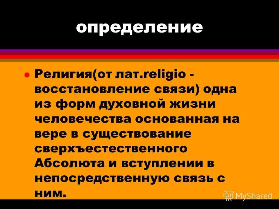определение l Религия(от лат.religio — восстановление связи) одна из форм духовной жизни человечества основанная на вере в существование сверхъестественного Абсолюта и вступлении в непосредственную связь с ним.