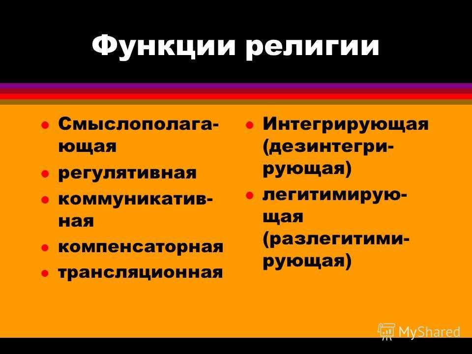 Функции религии l Cмыслополага- ющая l регулятивная l коммуникатив- ная l компенсаторная l трансляционная l Интегрирующая (дезинтегри- рующая) l легитимирую- щая (разлегитими- рующая)