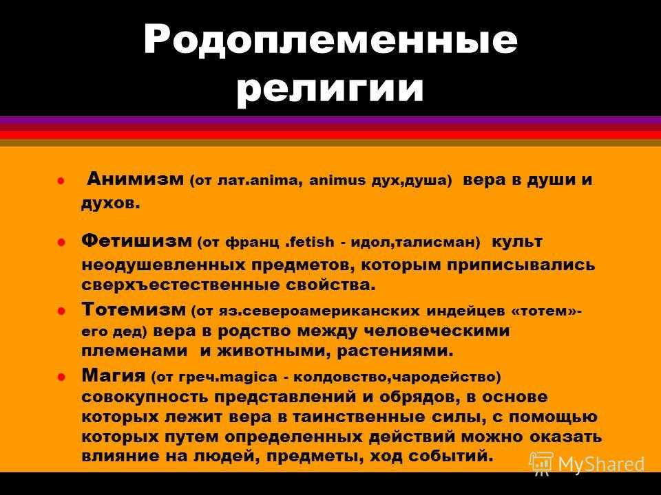 Родоплеменные религии l Анимизм (от лат.anima, animus дух,душа) вера в души и духов. l Фетишизм (от франц.fetish — идол,талисман) культ неодушевленных предметов, которым приписывались сверхъестественные свойства. l Тотемизм (от яз.североамериканских индейцев «тотем»- его дед) вера в родство между человеческими племенами и животными, растениями. l Магия (от греч.magica — колдовство,чародейство) совокупность представлений и обрядов, в основе которых лежит вера в таинственные силы, с помощью которых путем определенных действий можно оказать влияние на людей, предметы, ход событий.