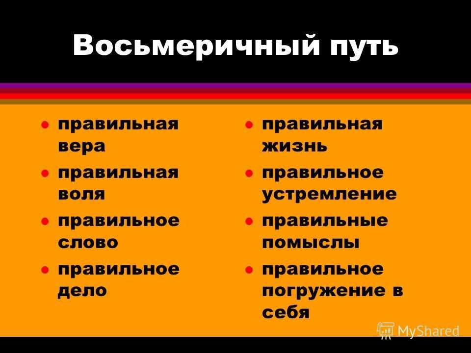 Восьмеричный путь l правильная вера l правильная воля l правильное слово l правильное дело l правильная жизнь l правильное устремление l правильные помыслы l правильное погружение в себя
