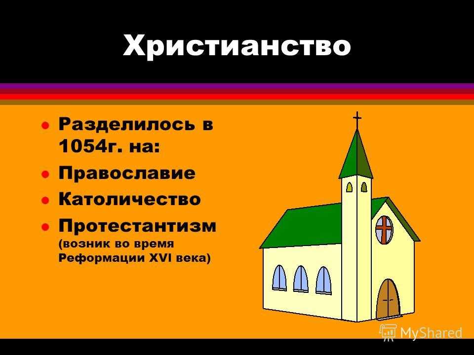 Христианство l Разделилось в 1054г. на: l Православие l Католичество l Протестантизм (возник во время Реформации XVl века)