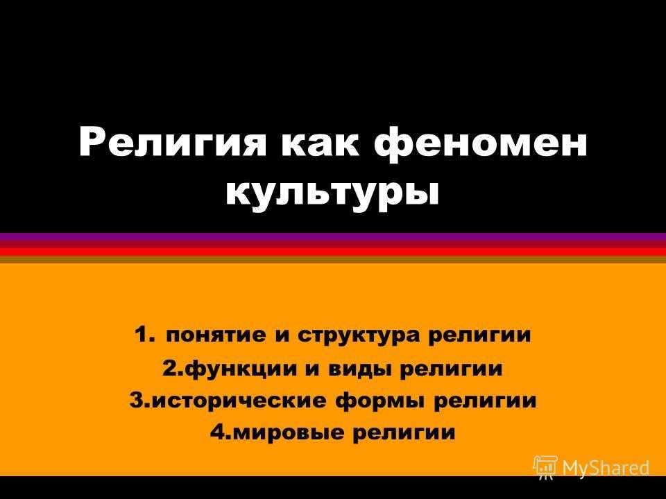 Презентация на тему: » Религия как феномен культуры 1. понятие и структура религии 2.функции и виды религии 3.исторические формы религии 4.мировые религии.» — Транскрипт: