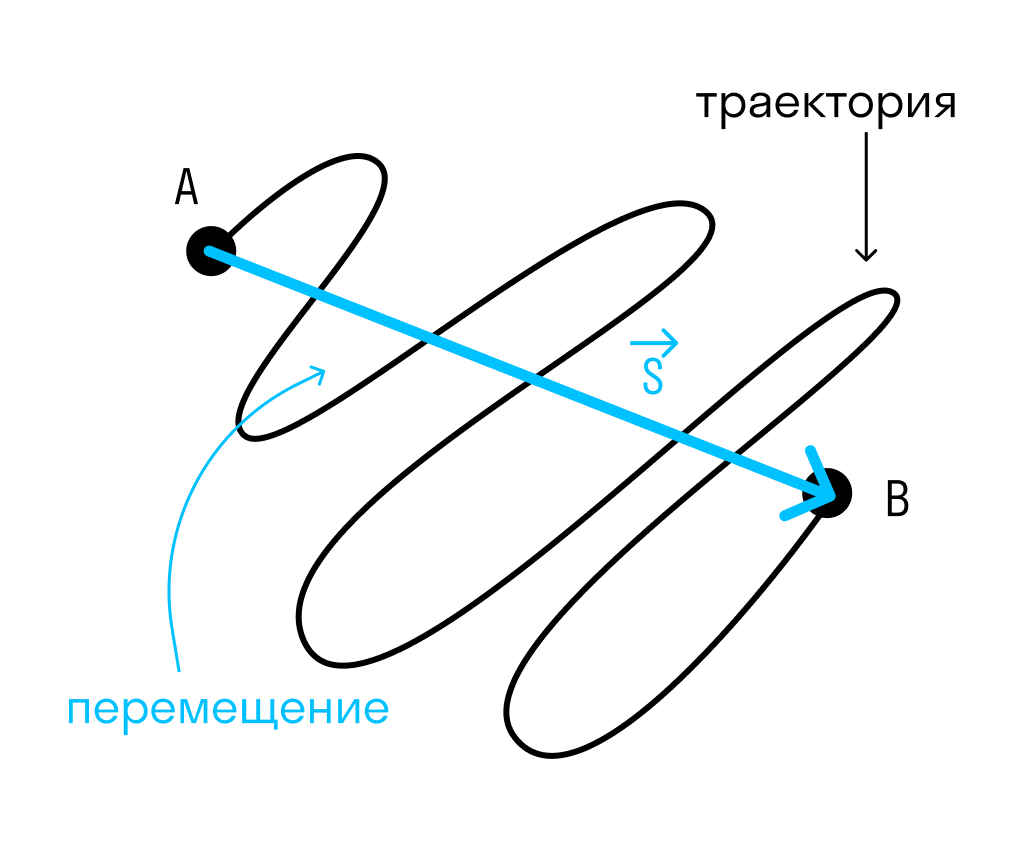 В чем разница между перемещением и путем? Перемещение — это вектор, проведенный из начальной точки в конечную, а путь — это длина траектории. |