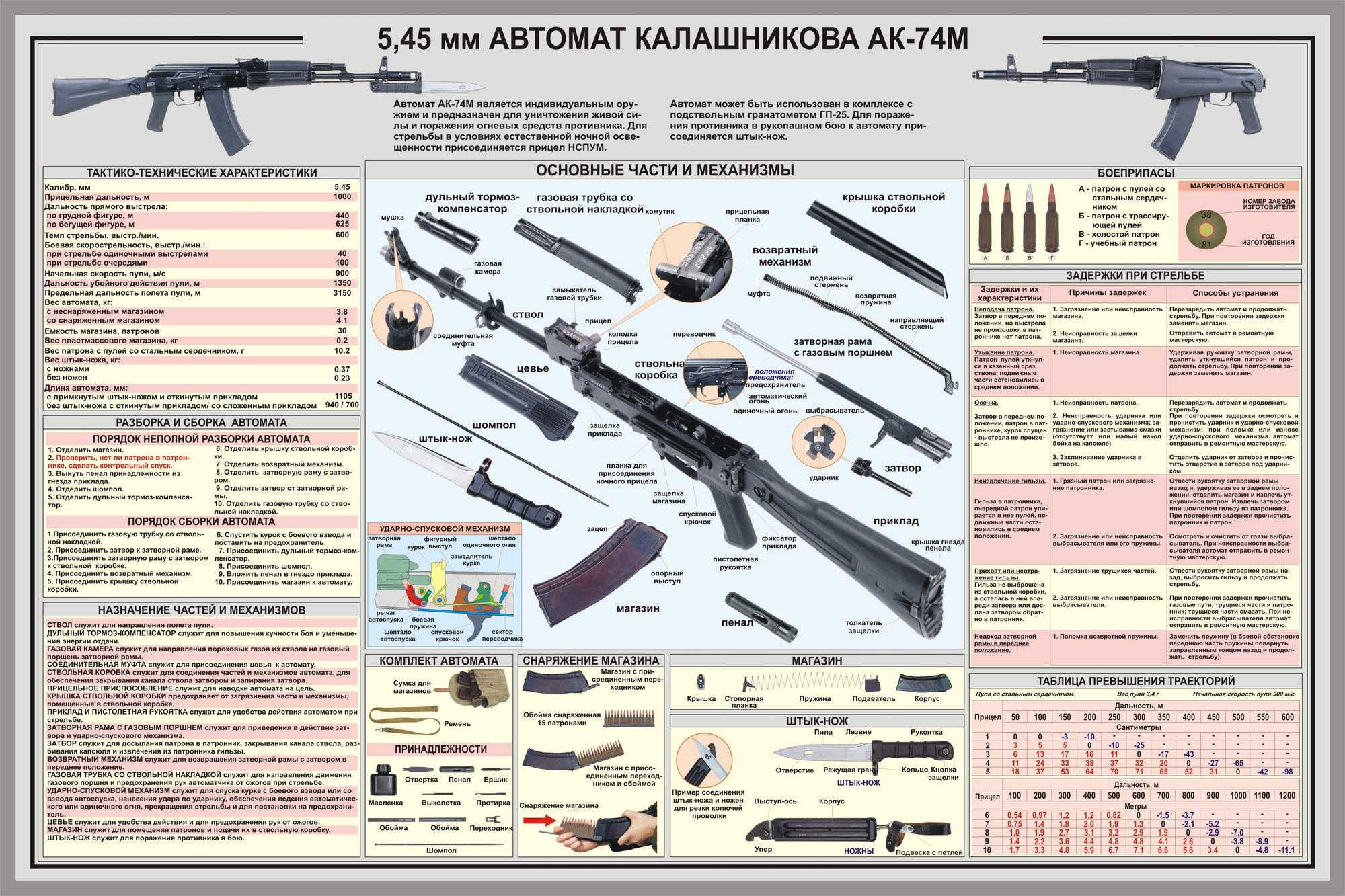 Технические характеристики АК-74 рассматривают по базовой модели. Модификации имеют определенные отличия в габаритах и весе, также меняется показатели и в случае специфических дополнений — применения других патронов, новых механизмов или иных устройств.