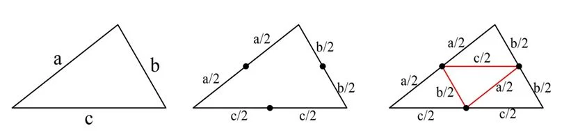 В итоге у каждого из получившегося треуг-ка стороны равны величинам а/2, b/2 и c/2. Значит, по 3-ему признаку равенства треуг-ков, они все равны друг другу, ч. т. д.