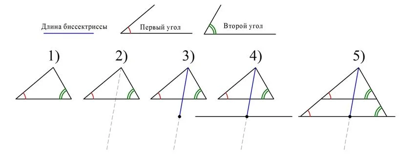 На первом шаге строится произвольный треуг-к, в котором два угла равны заданным в условии. На втором шаге третий угол получившегося треуг-ка разбивается пополам, то есть строится его биссектриса, причем она строится в виде луча, а не конечного отрезка. На третьем шаге на этом луче откладывается отрезок, длина которого совпадает с заданной длиной биссектрисы. В результате на луче можно отметить точку, которая соответствует концу этого отрезка. На шаге 4 через эту точку проводится прямая, параллельная основанию уже построенного треуг-ка. Наконец, на последнем шаге стороны треуг-ка продлеваются до пересечения с новой прямой. В итоге получается новый треуг-к, который будет соответствовать условиям задачи.