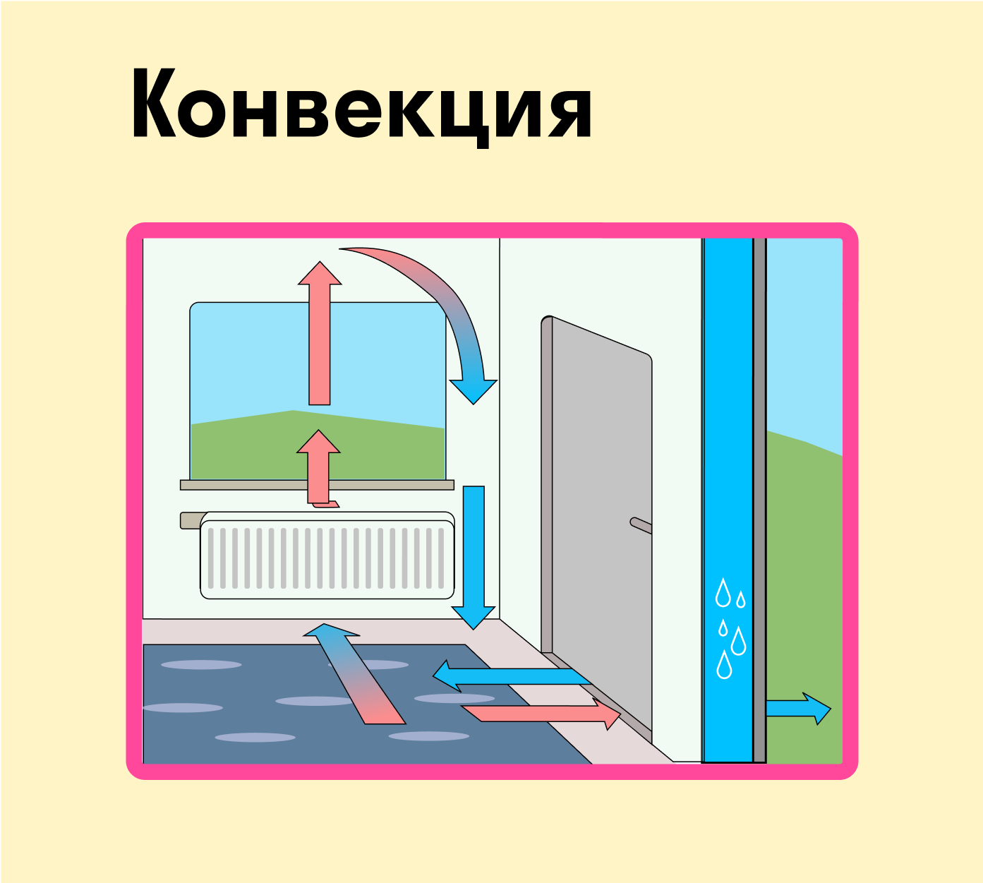 Когда мы говорили о теплопроводности, мы приводили в пример батарею. Теплопроводность — это когда мы получаем тепло, прикоснувшись к батарее. Но все вещи в комнате к батарее не прикасаются, а комната греется. Здесь вступает конвекция.