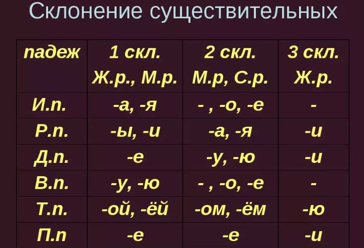 Таблица склонений (1, 2, 3) и таблица склонений разных типов позволят успешно освоить школьную программу и сдать экзамены.