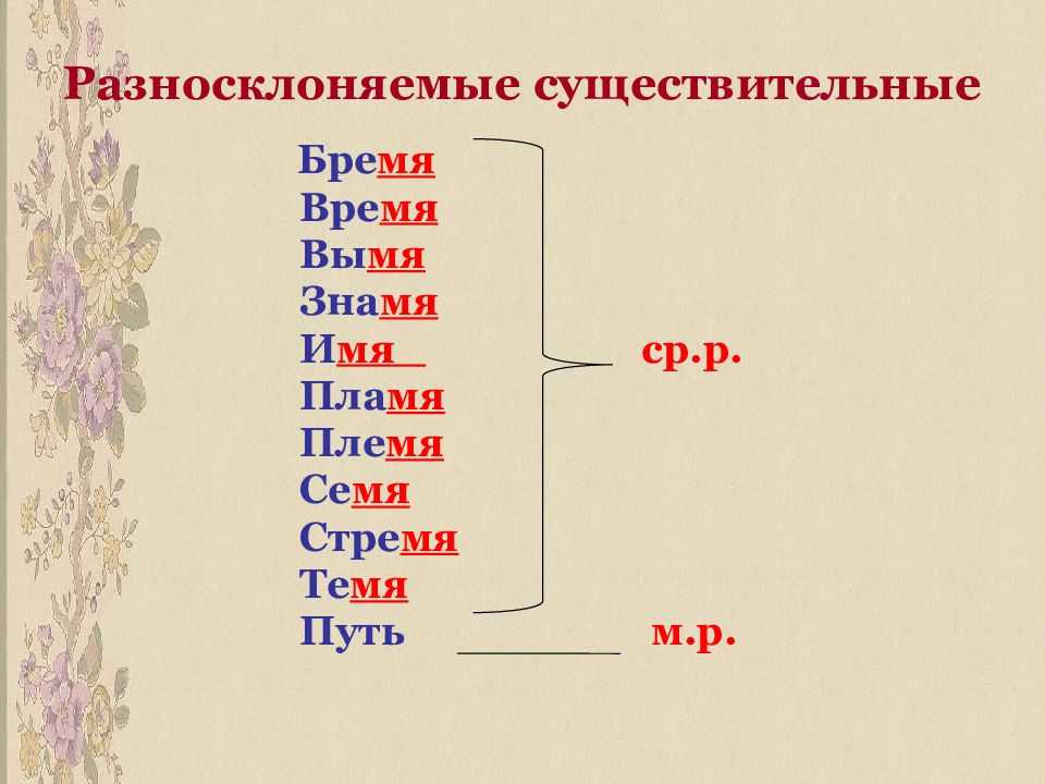 Разносклоняемые, имеющие разные формы в разных падежах по нехарактерному типу для какого-либо определенного склонения. Таких существительных крайне мало и определить их довольно легко. Это слова оканчивающиеся на –мя: вымя, племя, знамя и другие. Также сюда можно приписать сюда слова: -дитя и –путь. Путь во всех формах принадлежит в единственном числе к третьему склонению, но если посмотреть как образуется творительный падеж, то окажется, что данное слово имеет форму второго склонения: — путем.