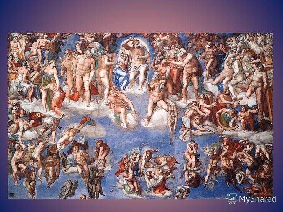 Часто Микеланджело писал персонажа обнаженным. А потом уже сверху дописывал одежду. Чтобы тело было максимально рельефным.