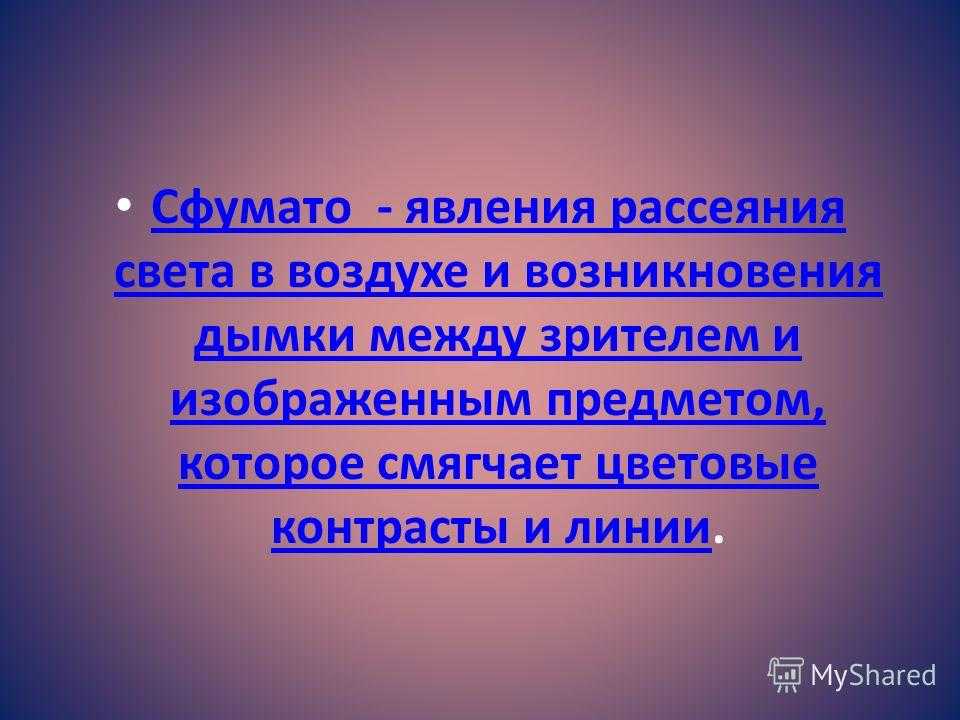 Сфумато — явления рассеяния света в воздухе и возникновения дымки между зрителем и изображенным предметом, которое смягчает цветовые контрасты и линии. Сфумато — явления рассеяния света в воздухе и возникновения дымки между зрителем и изображенным предметом, которое смягчает цветовые контрасты и линии