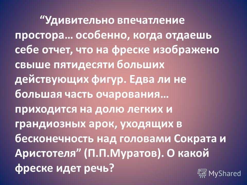 Удивительно впечатление простора… особенно, когда отдаешь себе отчет, что на фреске изображено свыше пятидесяти больших действующих фигур. Едва ли не большая часть очарования… приходится на долю легких и грандиозных арок, уходящих в бесконечность над головами Сократа и Аристотеля (П.П.Муратов). О какой фреске идет речь?