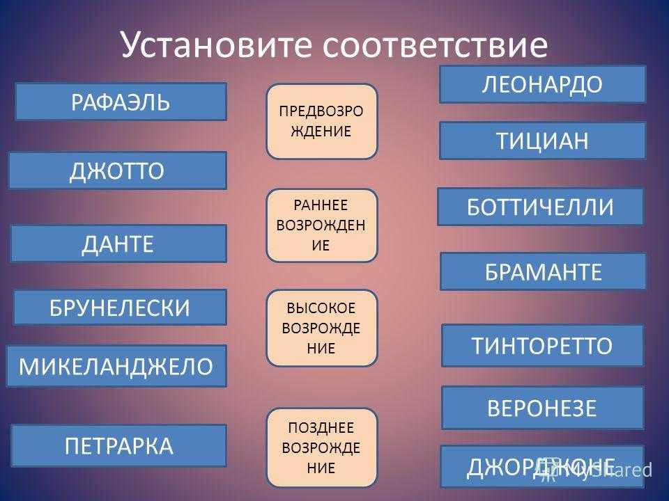Установите соответствие РАФАЭЛЬ ТИЦИАН ДЖОТТО БОТТИЧЕЛЛИ ДАНТЕ БРАМАНТЕ БРУНЕЛЕСКИ ЛЕОНАРДО ТИНТОРЕТТО МИКЕЛАНДЖЕЛО ПЕТРАРКА ВЕРОНЕЗЕ ДЖОРДЖОНЕ ПРЕДВОЗРО ЖДЕНИЕ РАННЕЕ ВОЗРОЖДЕН ИЕ ВЫСОКОЕ ВОЗРОЖДЕ НИЕ ПОЗДНЕЕ ВОЗРОЖДЕ НИЕ