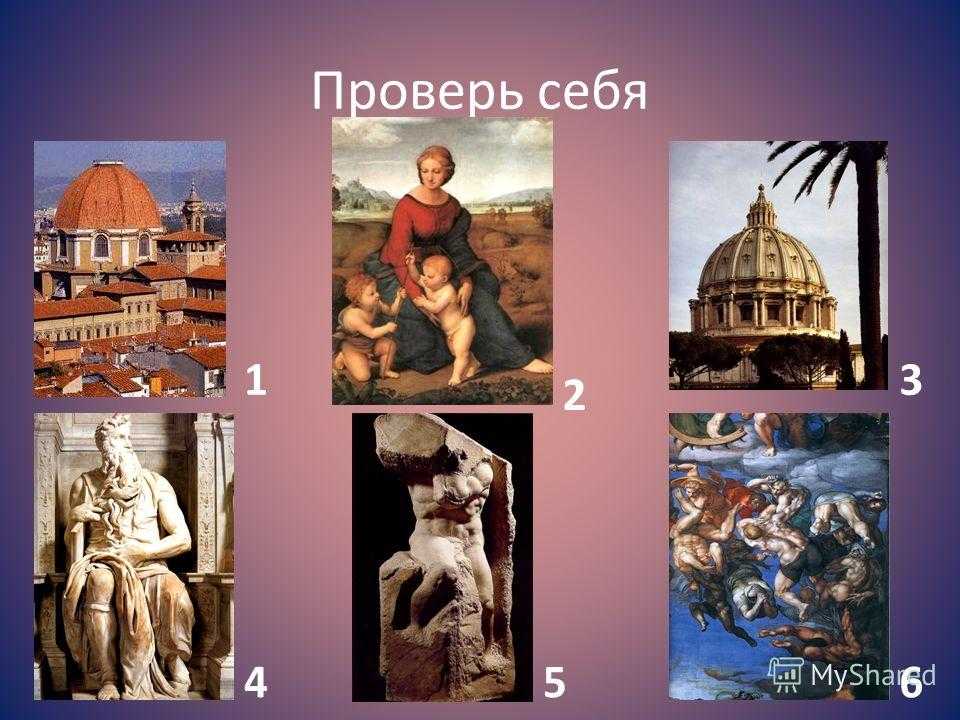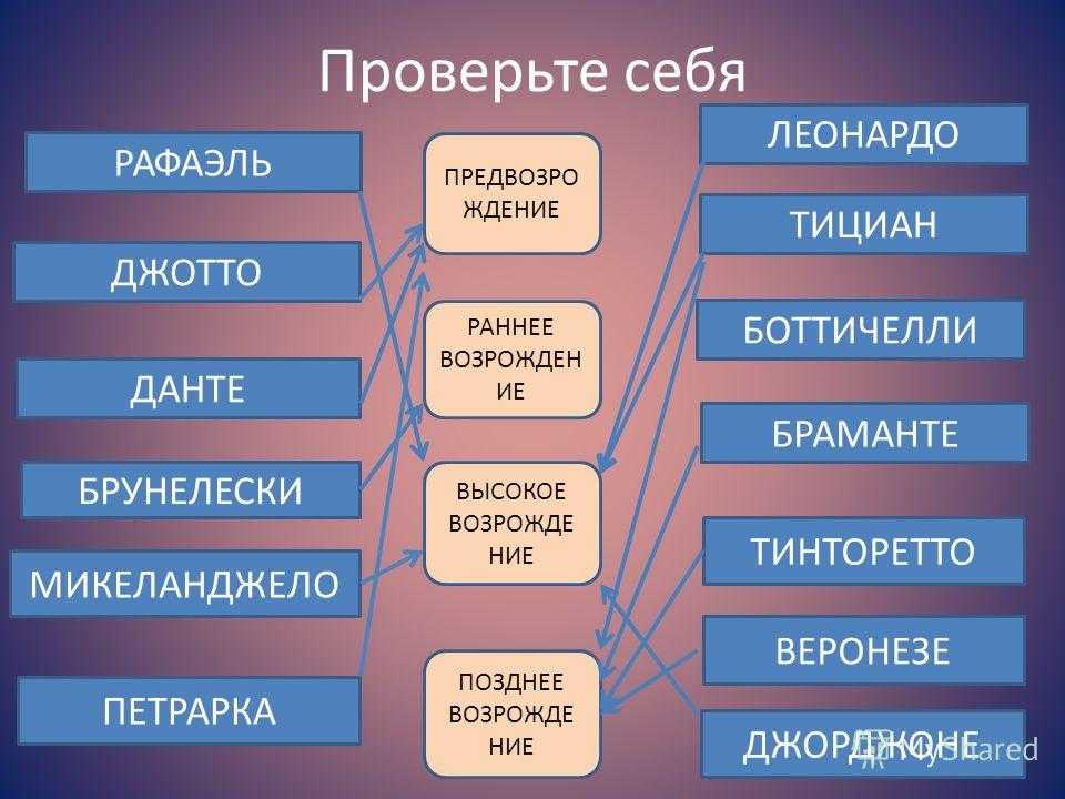 Проверьте себя РАФАЭЛЬ ТИЦИАН ДЖОТТО БОТТИЧЕЛЛИ ДАНТЕ БРАМАНТЕ БРУНЕЛЕСКИ ЛЕОНАРДО ТИНТОРЕТТО МИКЕЛАНДЖЕЛО ПЕТРАРКА ВЕРОНЕЗЕ ДЖОРДЖОНЕ ПРЕДВОЗРО ЖДЕНИЕ РАННЕЕ ВОЗРОЖДЕН ИЕ ВЫСОКОЕ ВОЗРОЖДЕ НИЕ ПОЗДНЕЕ ВОЗРОЖДЕ НИЕ