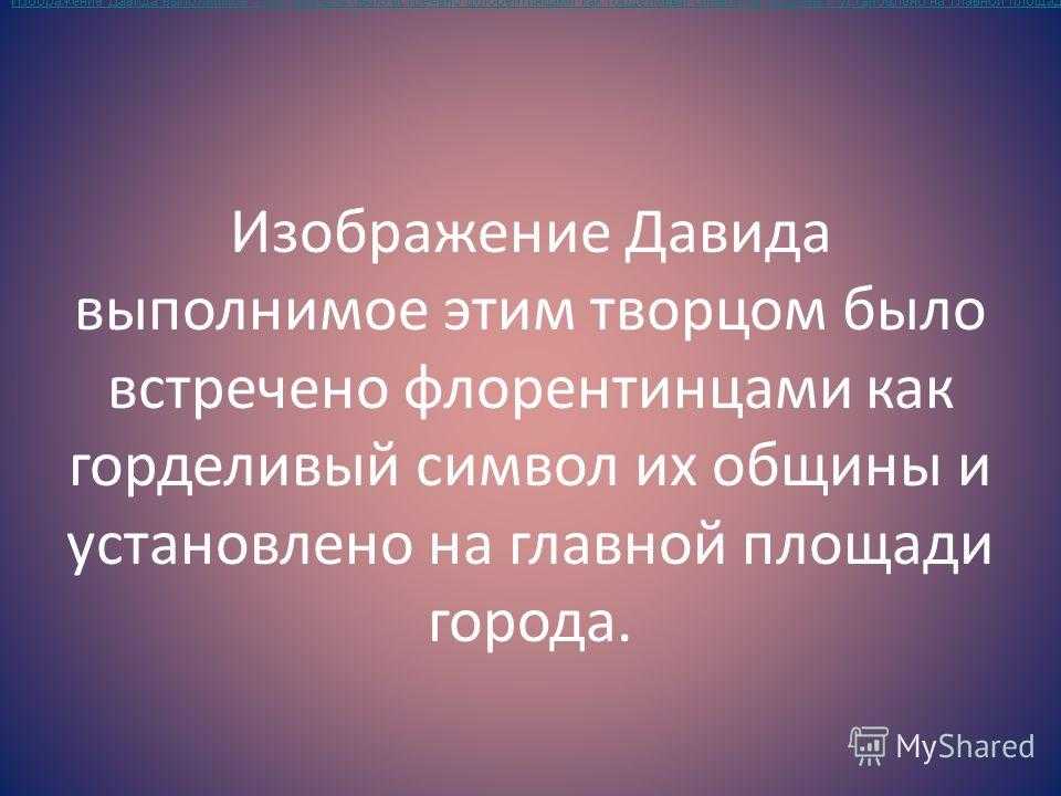 Изображение Давида выполнимое этим творцом было встречено флорентинцами как горделивый символ их общины и установлено на главной площади города.