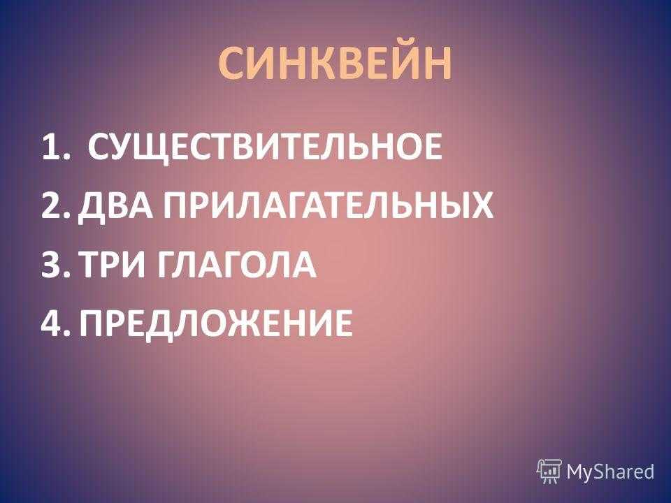 СИНКВЕЙН 1. СУЩЕСТВИТЕЛЬНОЕ 2.ДВА ПРИЛАГАТЕЛЬНЫХ 3.ТРИ ГЛАГОЛА 4.ПРЕДЛОЖЕНИЕ