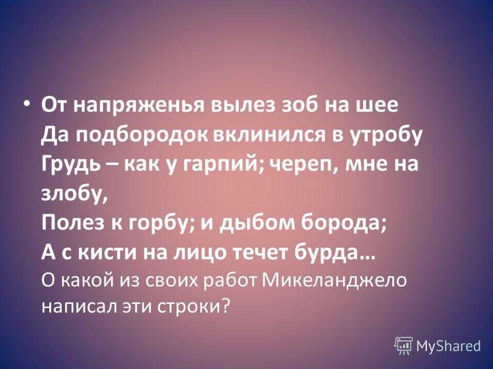 От напряженья вылез зоб на шее Да подбородок вклинился в утробу Грудь – как у гарпий; череп, мне на злобу, Полез к горбу; и дыбом борода; А с кисти на лицо течет бурда… О какой из своих работ Микеланджело написал эти строки?