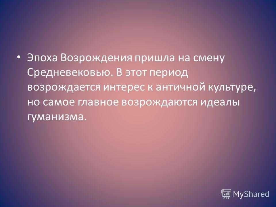 Эпоха Возрождения пришла на смену Средневековью. В этот период возрождается интерес к античной культуре, но самое главное возрождаются идеалы гуманизма.