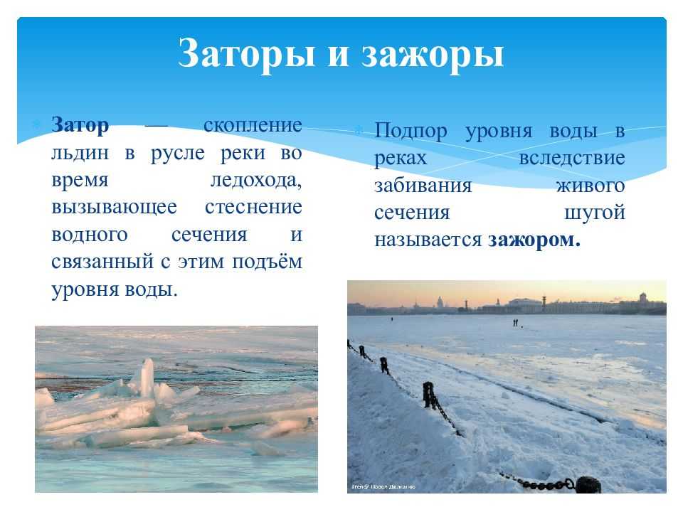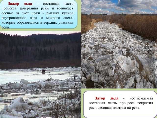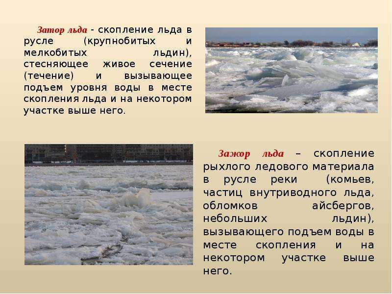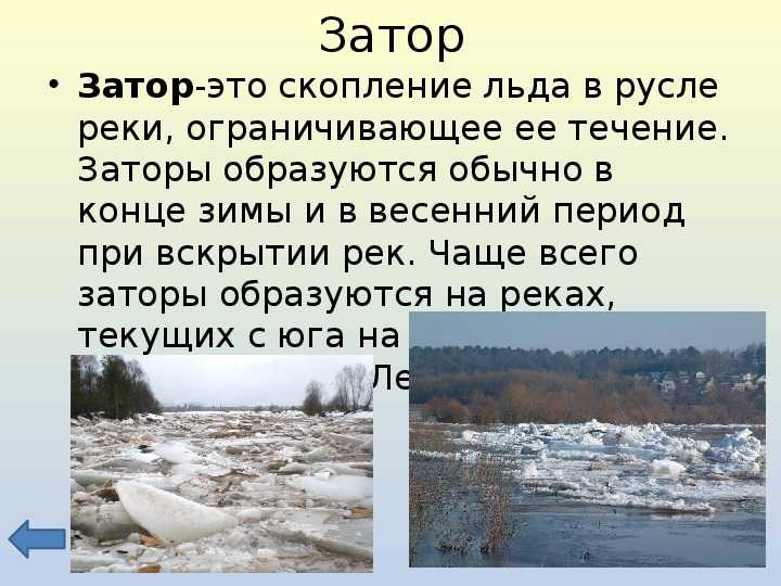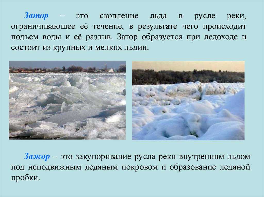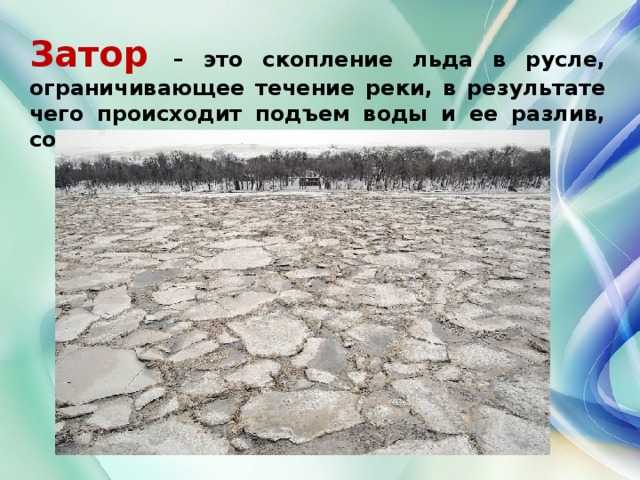 Что такое затор? Это следствие разрушения ледяного покрова, скопление дрейфующих льдин. Может быть двух типов: