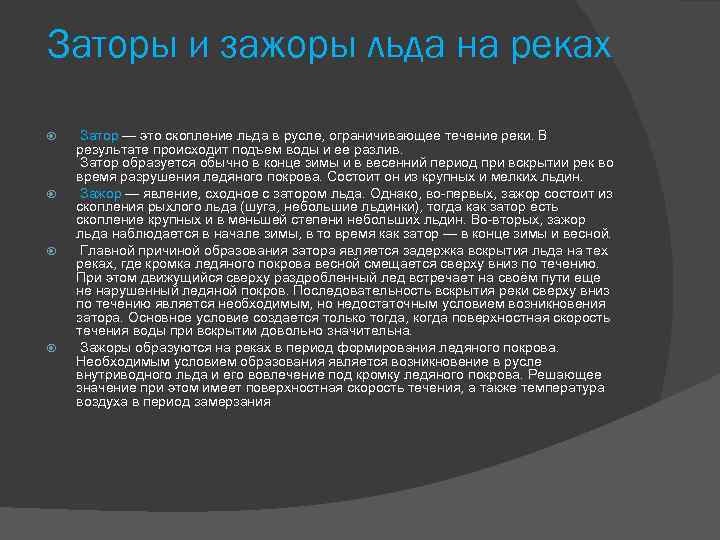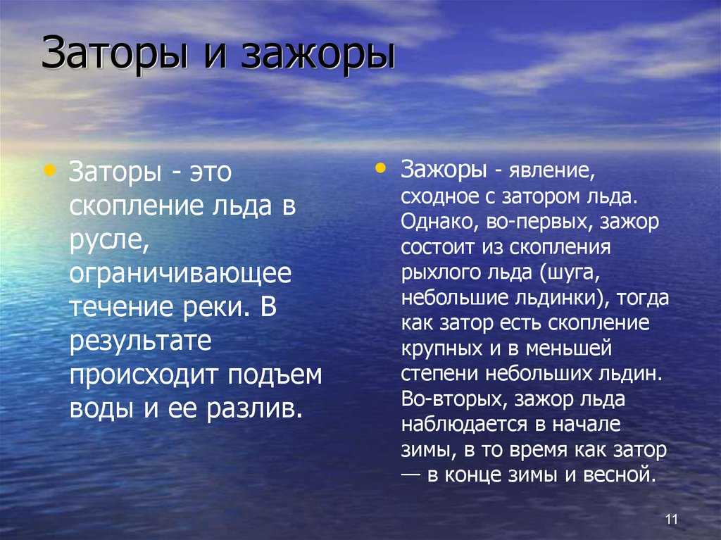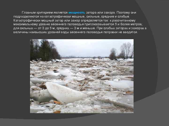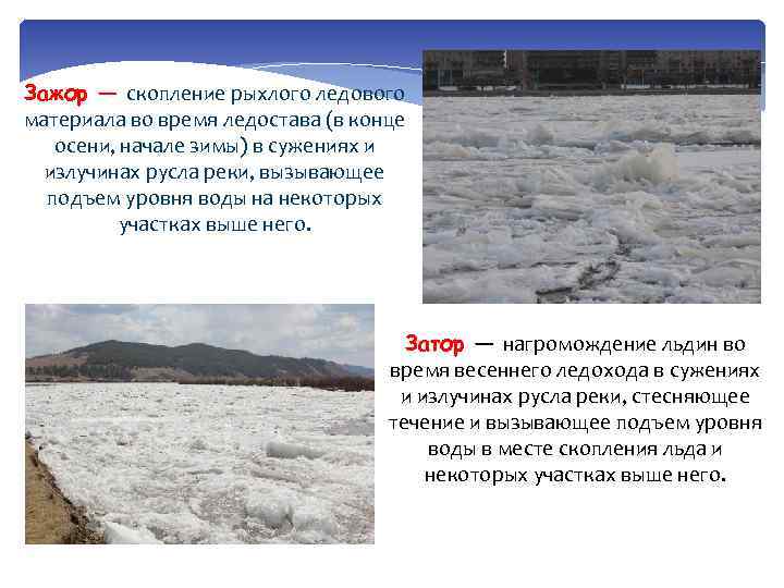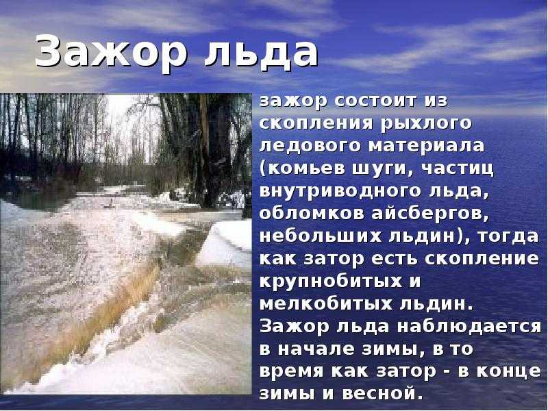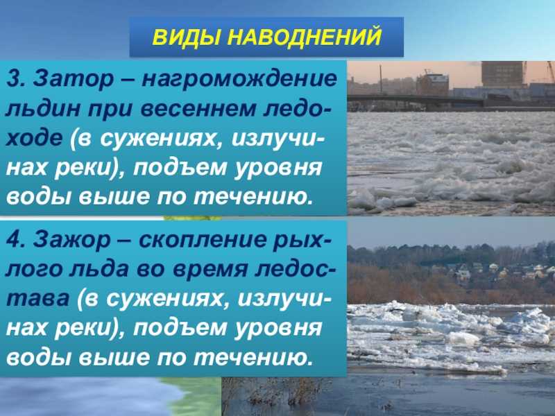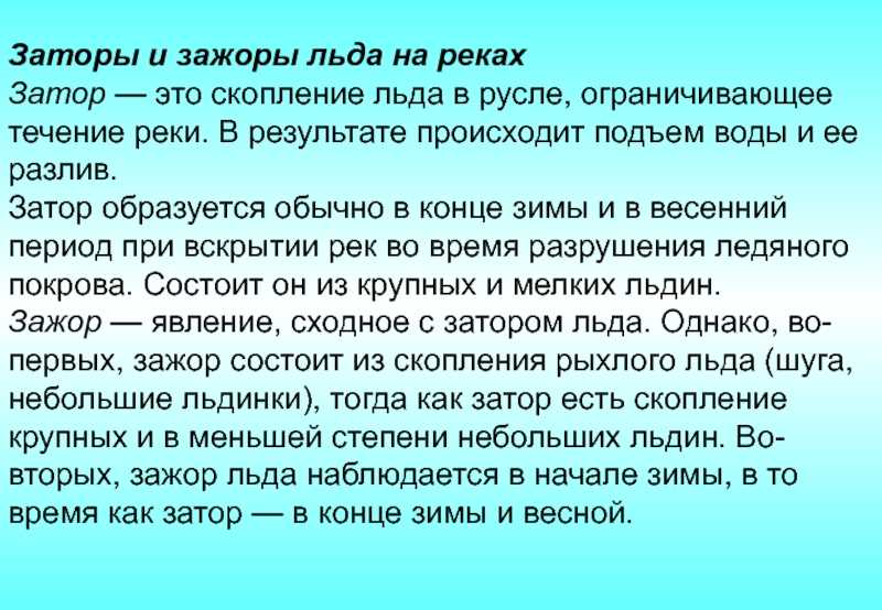 Что такое затор? Это следствие разрушения ледяного покрова, скопление дрейфующих льдин. Может быть двух типов: