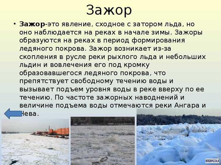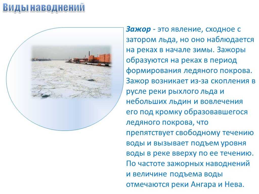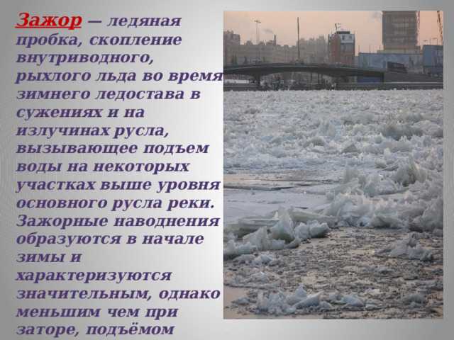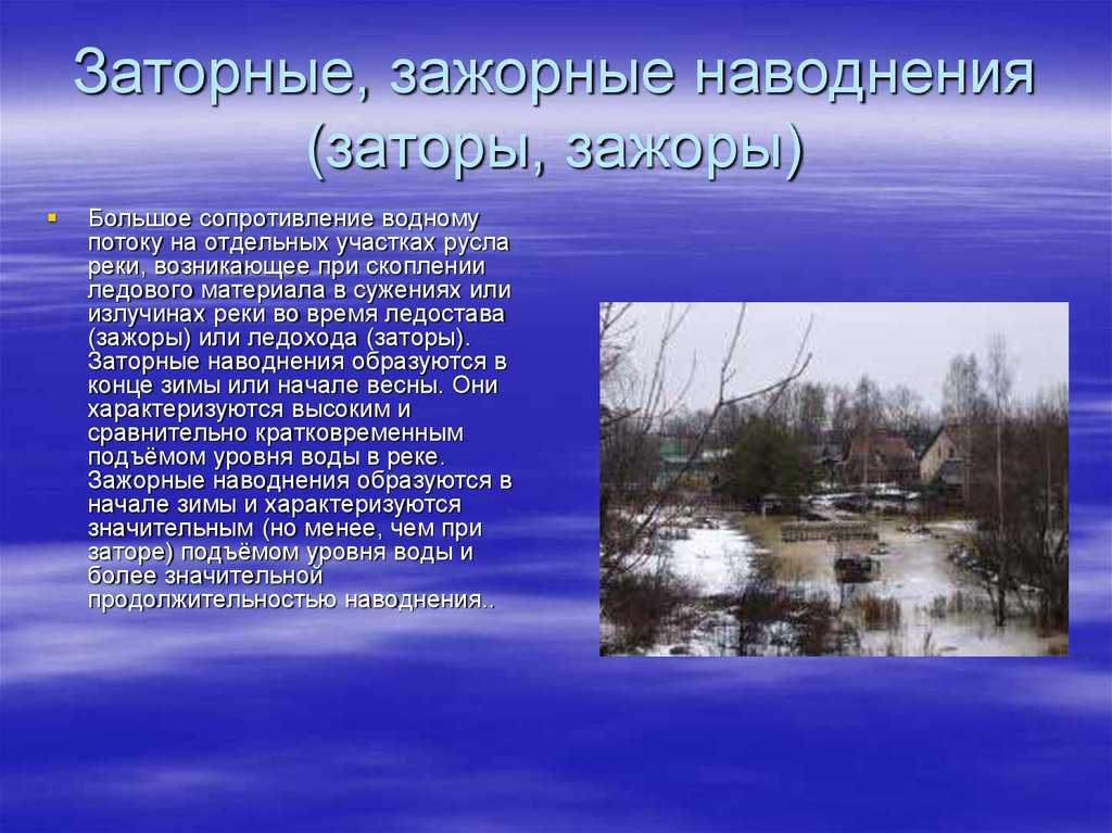 Это явление, представляющее собой скопление взрыхленного льда, наблюдается в осенние и зимние месяцы на участках водотоков, где происходит активное образование шуги при измененном уклоне течения воды. При зажорном наводнении существенно уменьшается сечение речного русла, в результате уровень воды повышается.