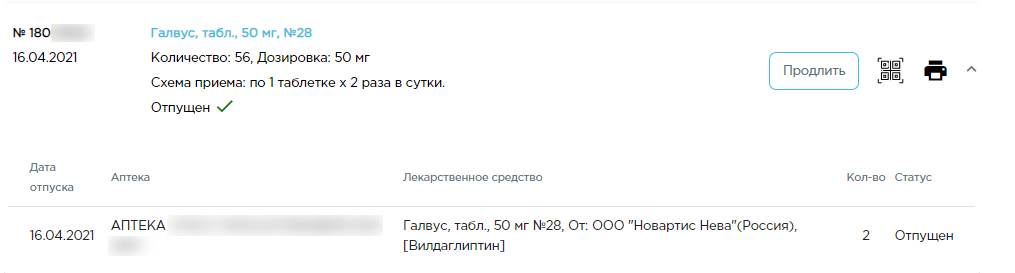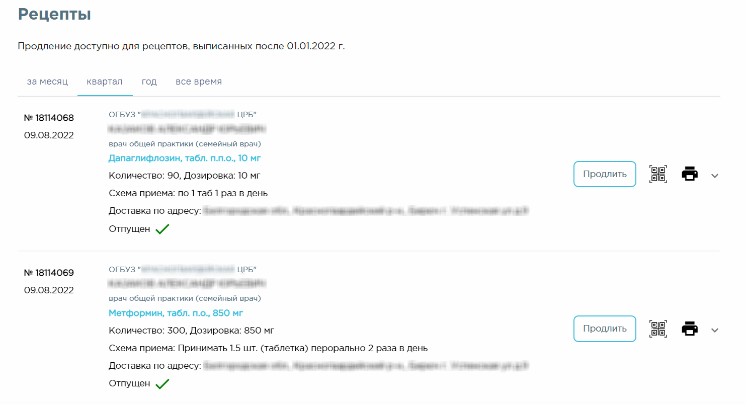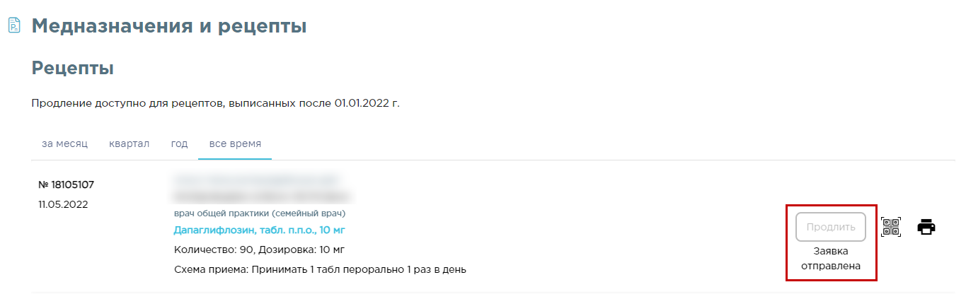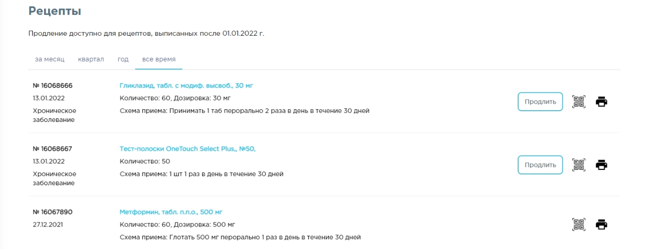 — при нажатии на пиктограмму открывается окно просмотра QR-кода рецепта. QR-код рецепта можно сохранить на телефон и предъявить в аптеке для получения препарата.