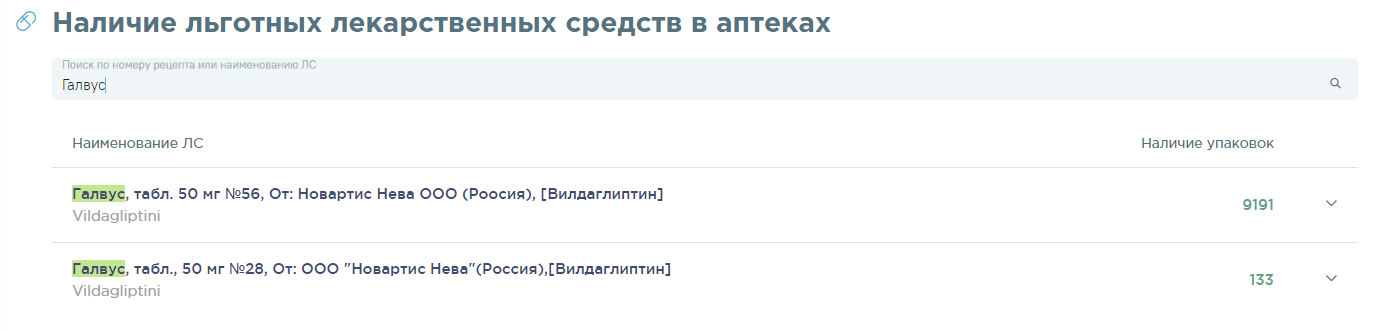 При нажатии на наименование препарата осуществится переход в поиск льготных лекарственных средств в аптеках по наименованию препарата.