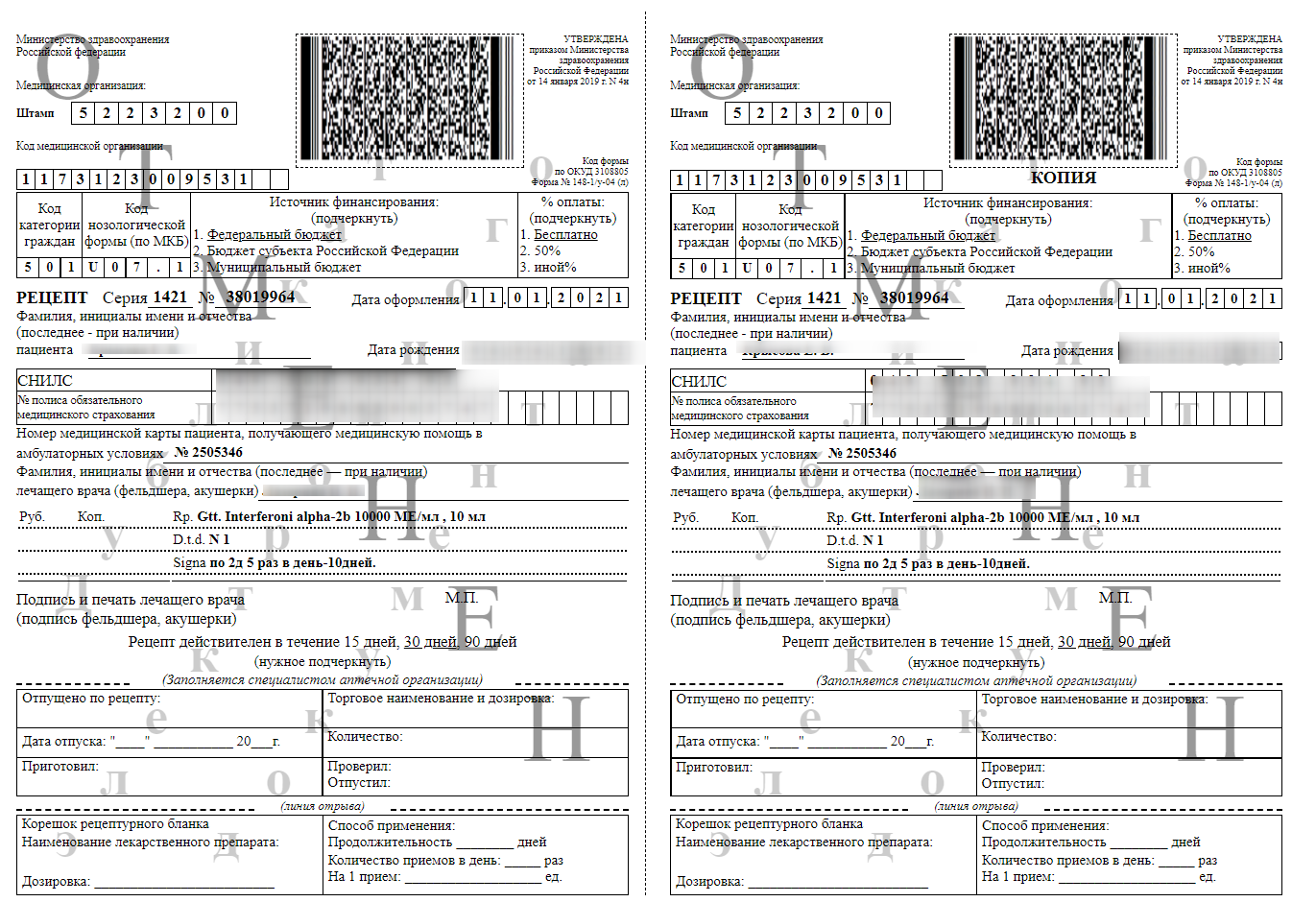 Подписывается электронный рецепт усиленной квалифицированной электронной подписью врача. По просьбе пациента одновременно может быть выписан и бумажный дубликат рецепта (п. 22 Порядка оформления рецептурных бланков).